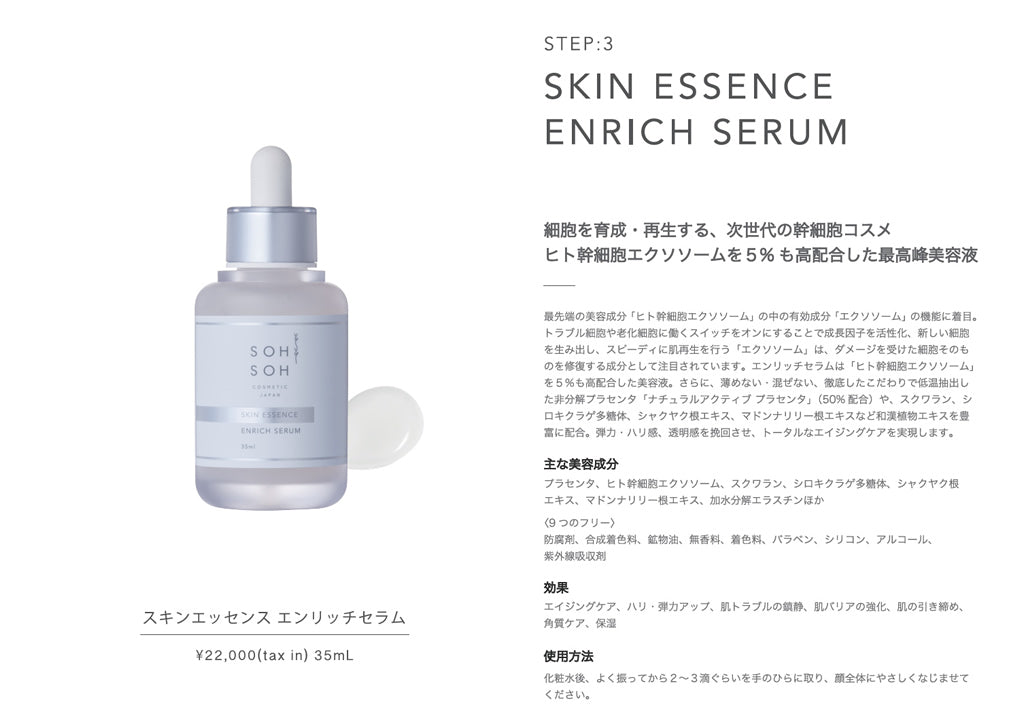 プラセンタエキス、ペンチレングリコール、ヒト脂肪間質細胞エクソソーム、パルミチン酸アスコルビルリン酸3Na、3−O−エチルアスコルビン酸、シロキクラゲ多糖体、カエサルピニアスピノサ果実エキス、カッパフィカスアルバレジエキス、加水分解コラーゲン、酵母β−グルカン、1,2−ヘキサンジオール、メチオニン、BG、フェノキシエタノール、水